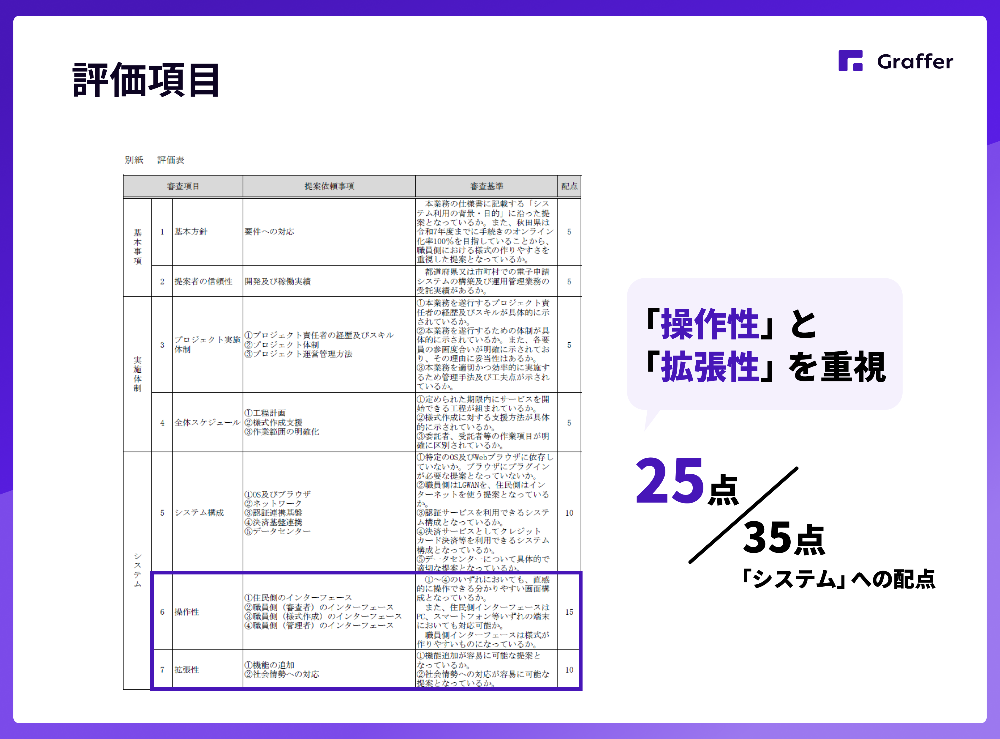 二木:「プロジェクト実施体制」や「システム構成」などの項目で評価を行いました。中でも「操作性」と「拡張性」については重視していました。