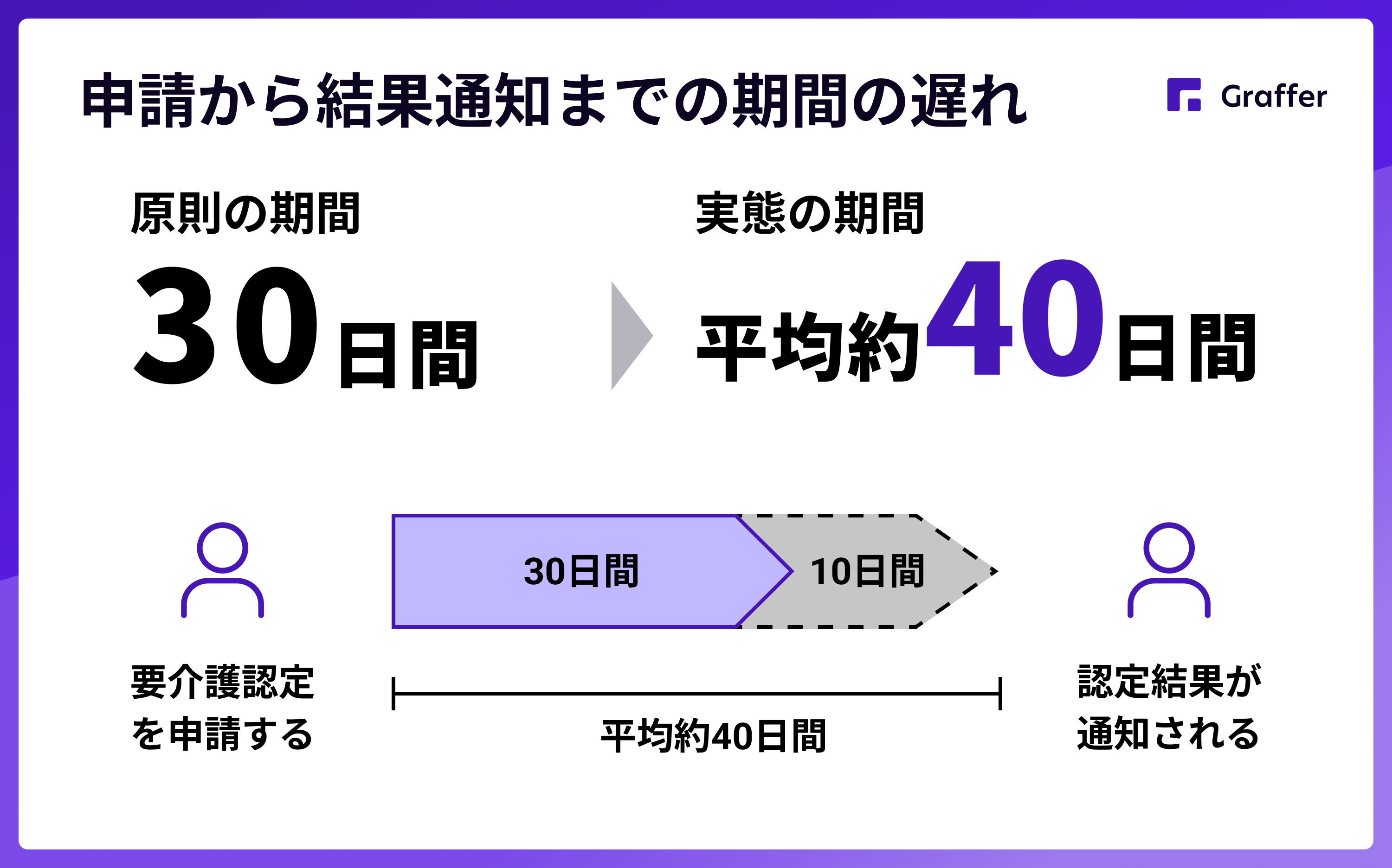 介護保険法で「原則30日以内」と定められている、要介護認定の申請から結果通知までの期間。しかし、申請件数の増加や人員不足を背景に、多くの自治体でこの基準を超えているのが実情です。厚生労働省の調査では、全国の平均処理日数は約40日と、基準を約10日も上回っています。