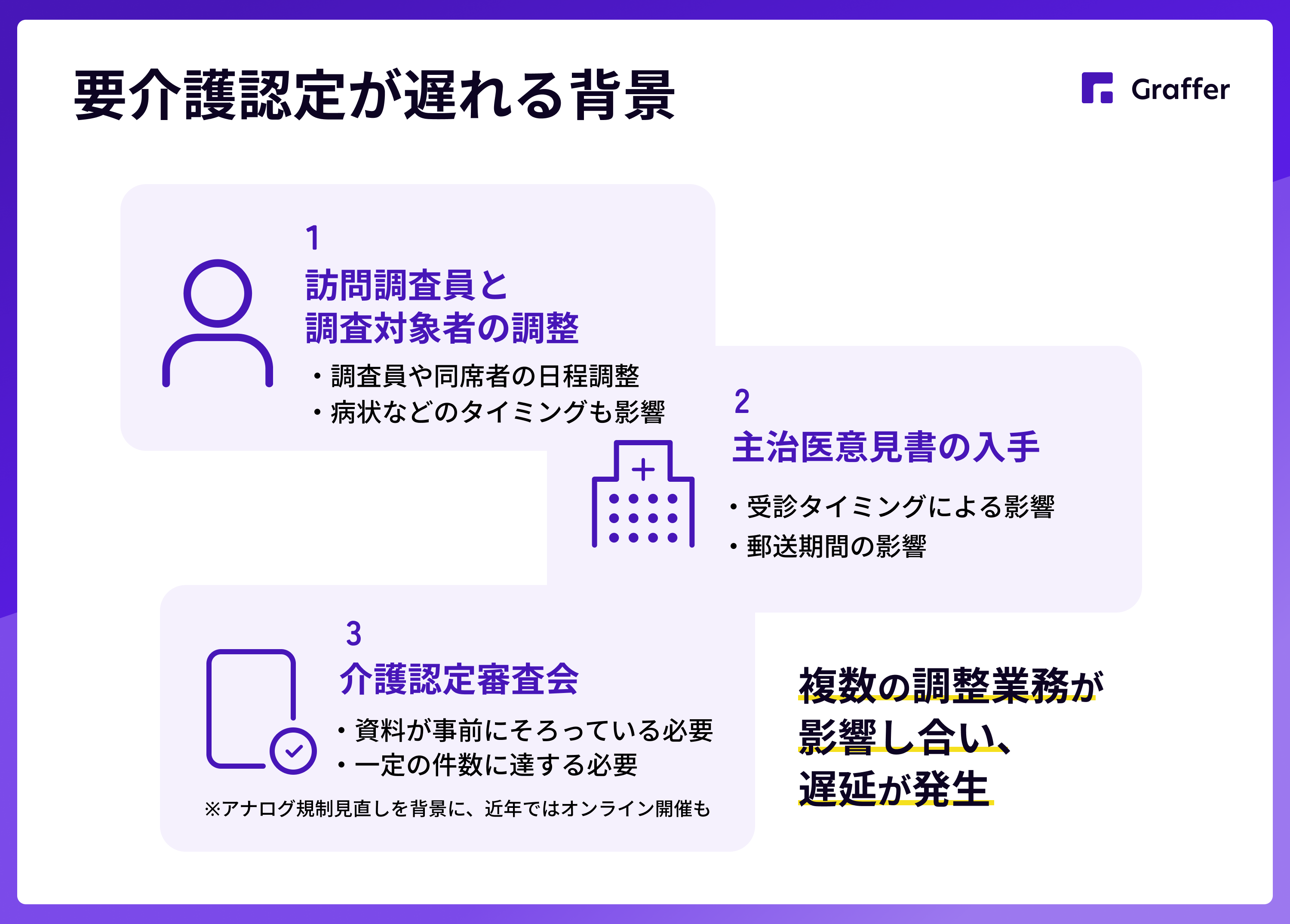 要介護認定が遅れる背景には、複数の調整業務が影響し合う構造的な問題があります。まず大きな課題となるのが、認定に欠かせない訪問調査の日程調整です。調査員が本人や家族、ケアマネジャーと日程を調整して現地に赴く必要があるうえ、近年では調査員不足に悩む自治体も少なくありません。