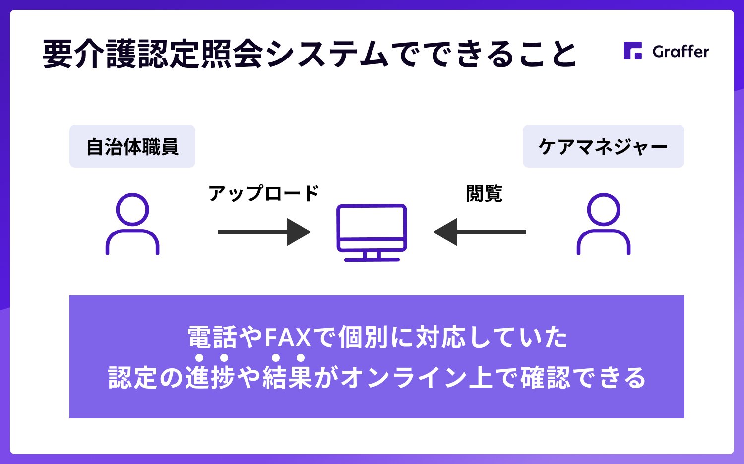 要介護認定照会システムとは、これまで電話やFAXで個別に対応していた、認定の進捗や結果に関する問い合わせについて、関係者がオンライン上でいつでも直接確認できるようにする仕組みです。